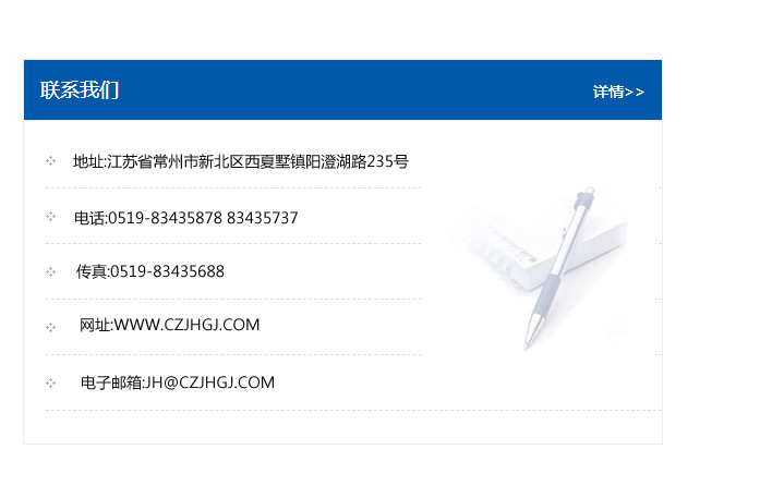 傳真:0519-83435688    郵編:213135    網址:WWW.czjhgj_com.jiulingwan.com    電子郵箱:JH@czjhgj_com.jiulingwan.com